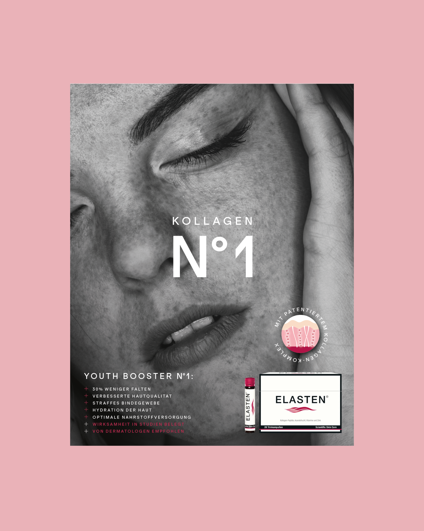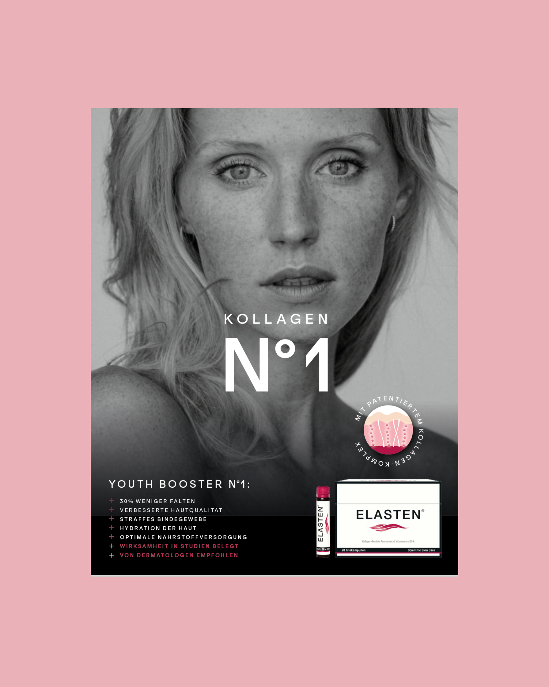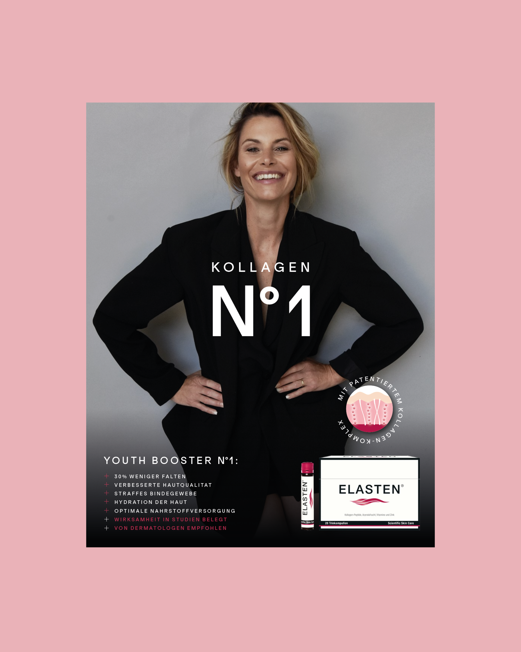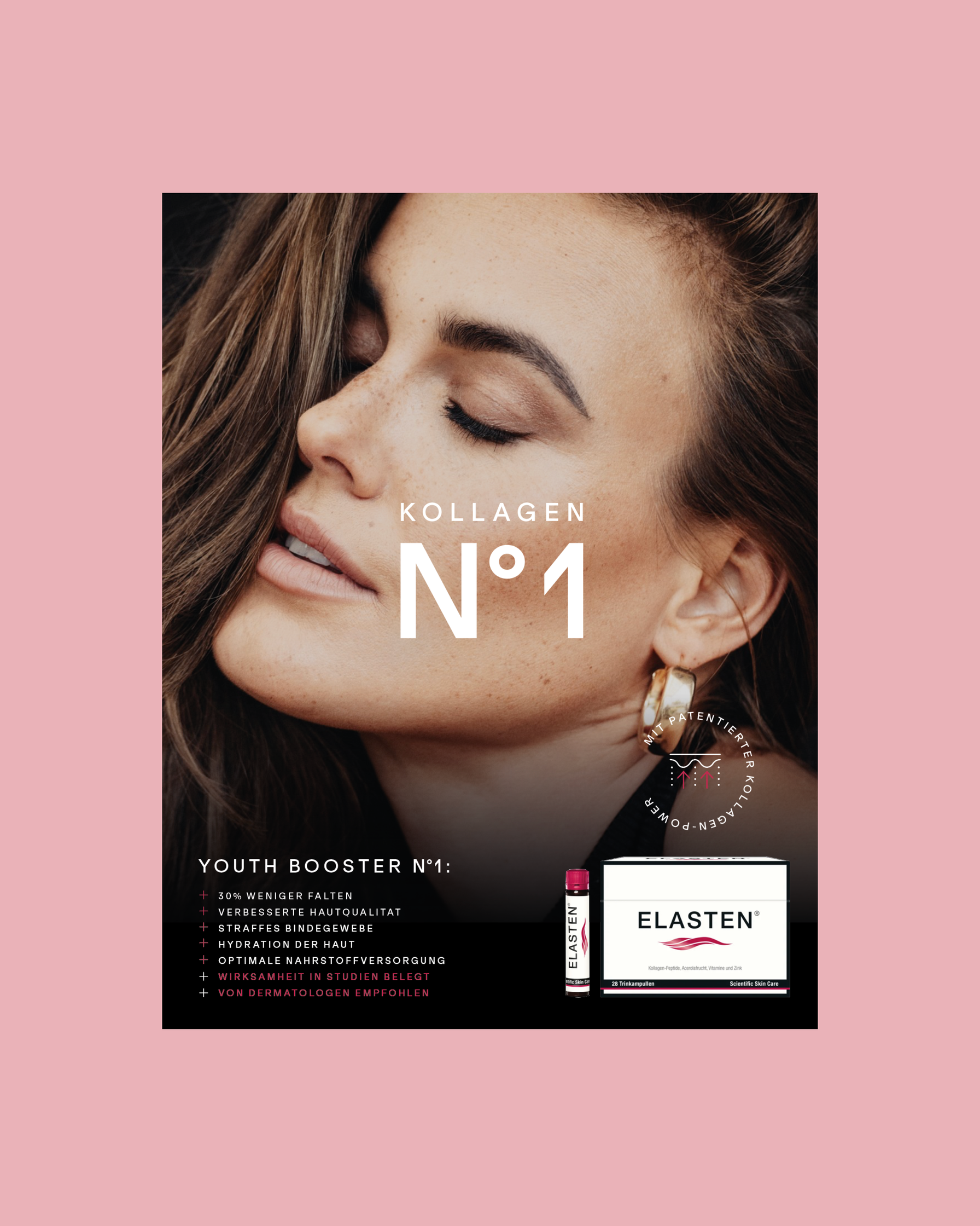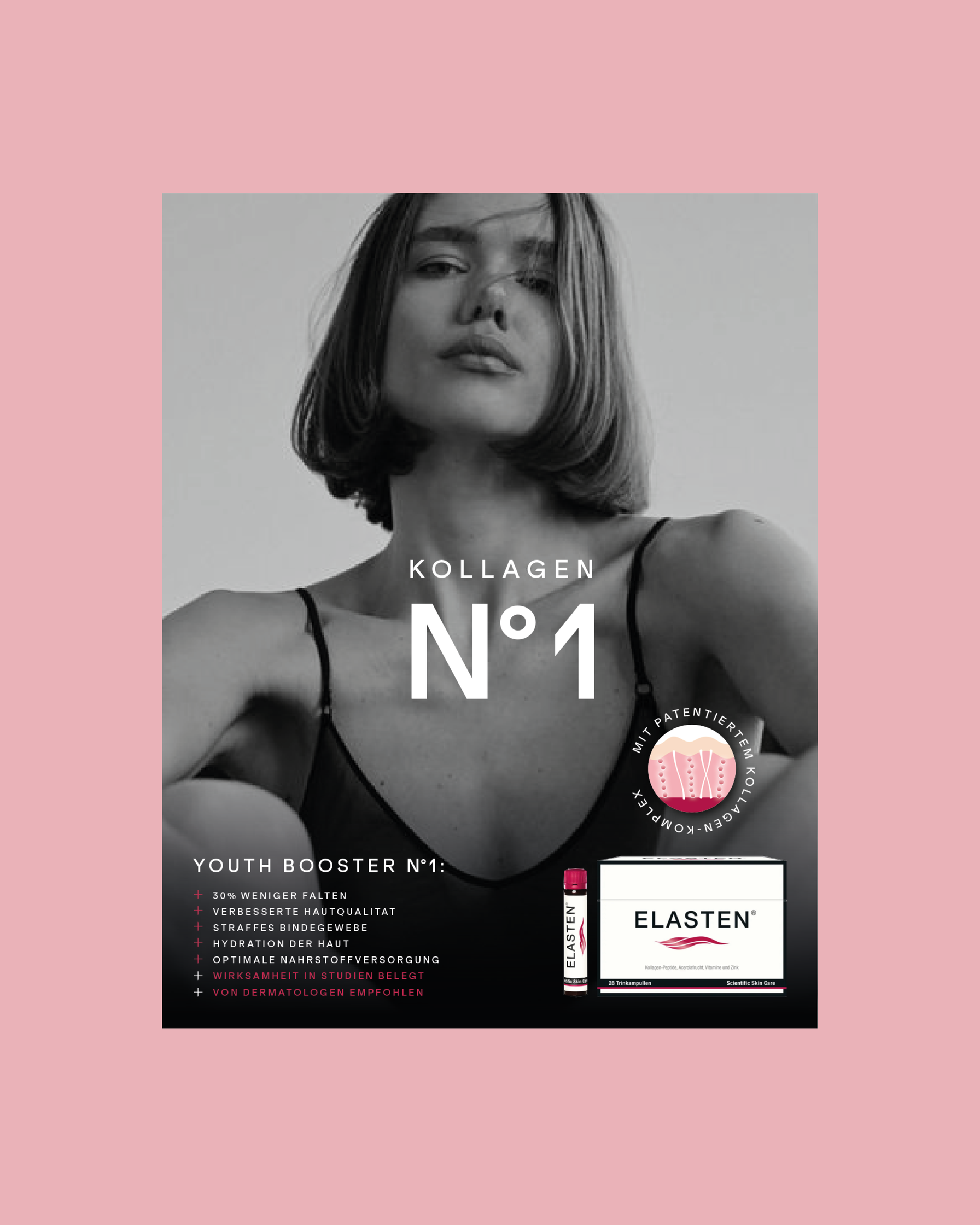 Kampagnen-Idee: Kollagen N°1 – ELASTEN® ist ein Premiumprodukt und die erste Wahl bei Kollagen-Supplements. Durch die optische Anlehnung an Chanel N°1 wird das Produkt ins Luxussegment gehoben. Eine Zusammenarbeit mit @eiglercommunication und @brandpepper.