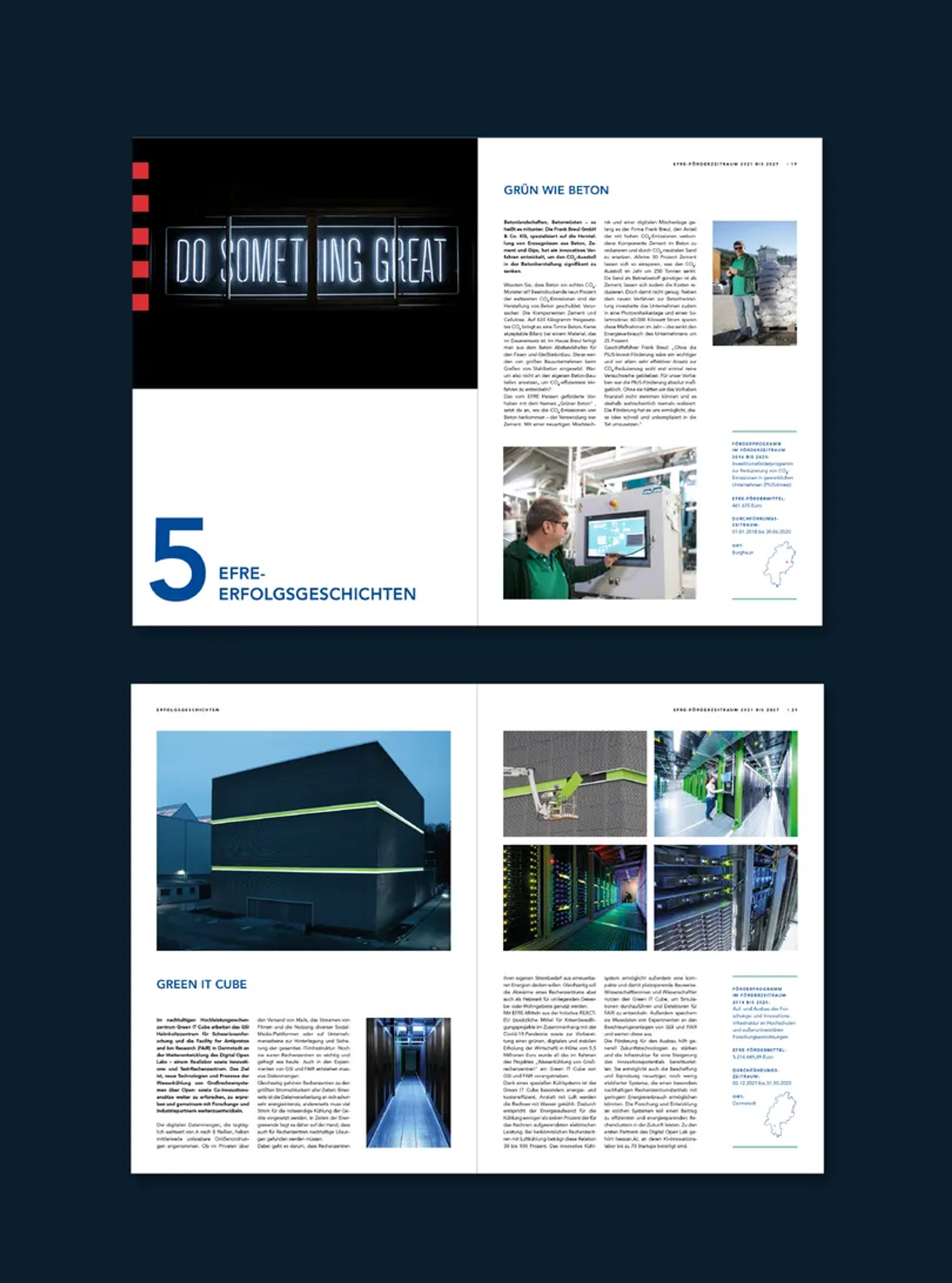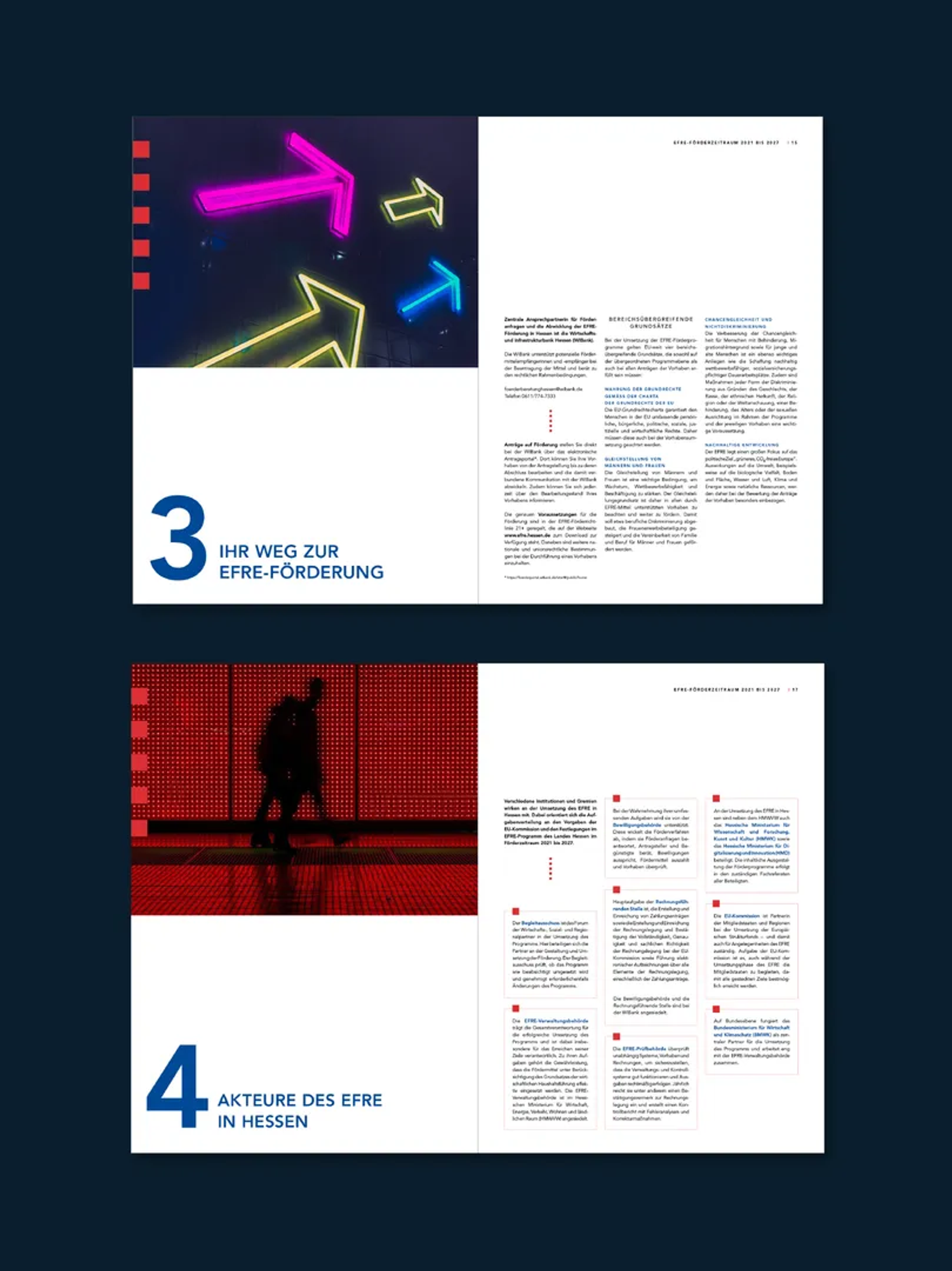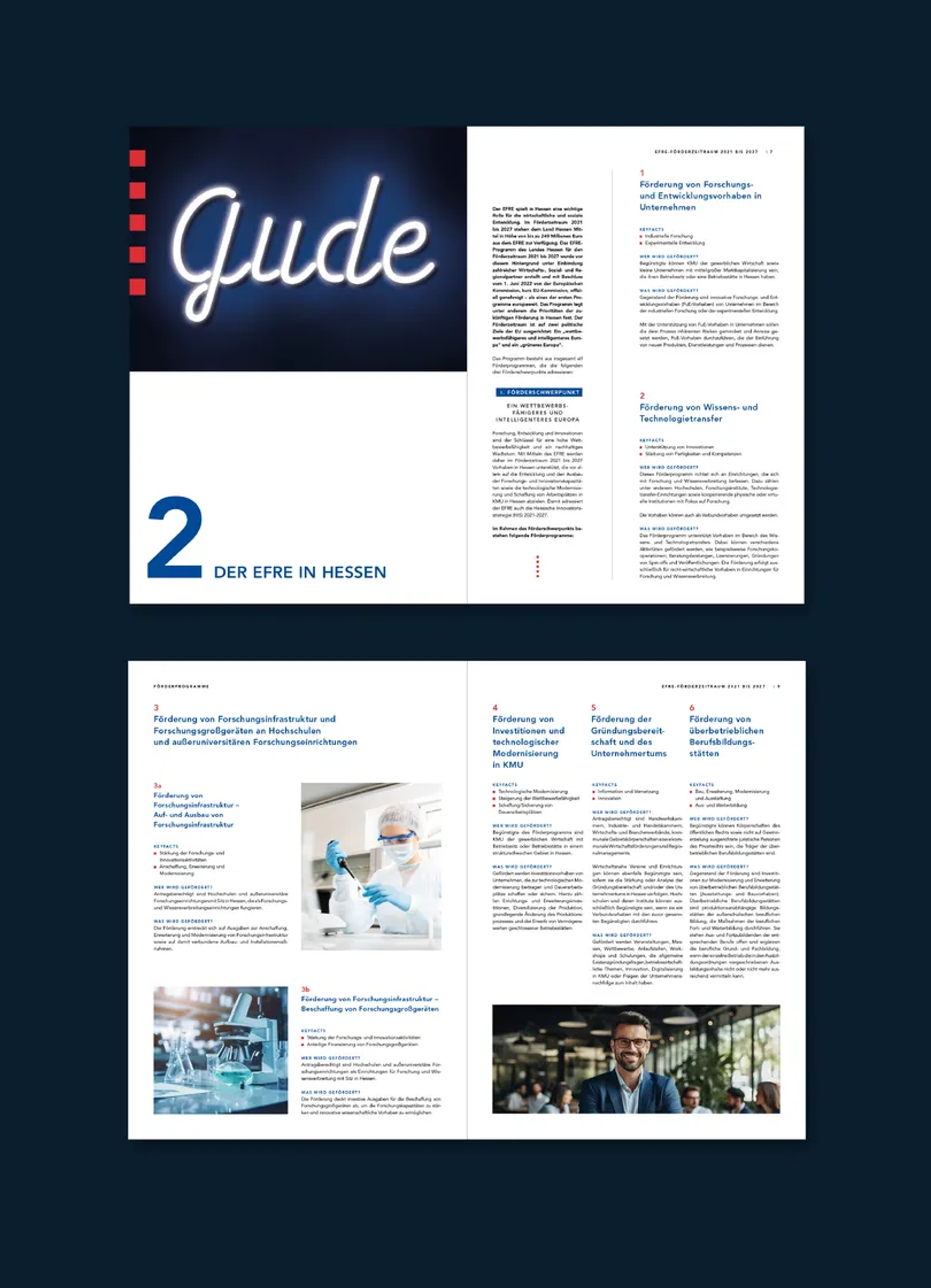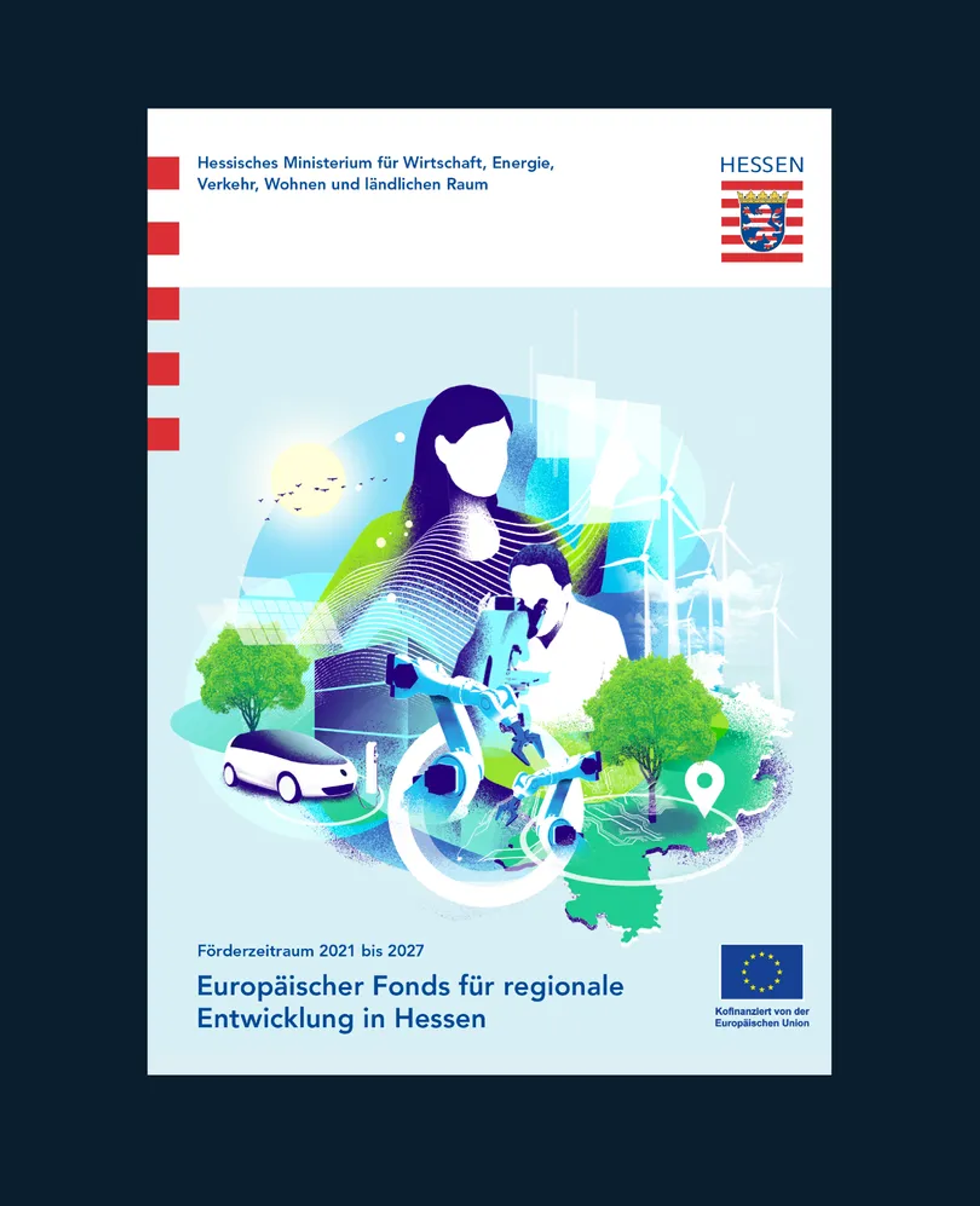 Gestaltung der EFRE-Broschüre zum Thema 'Europäische Fonds für regionale Entwicklung in Hessen' für das Hessische Ministerium für Wirtschaft, Energie, Verkehr, Wohnen und ländlichem Raum. 24 Seiten Eine Zusammenarbeit mit Fazit Communication.